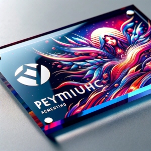 アクリル銘板のUV印刷のイメージ画像です。鮮やかな色彩と高解像度のグラフィックが特徴的で、会社のロゴや芸術的な要素が含まれています。アクリルの表面は滑らかで光沢があります。
